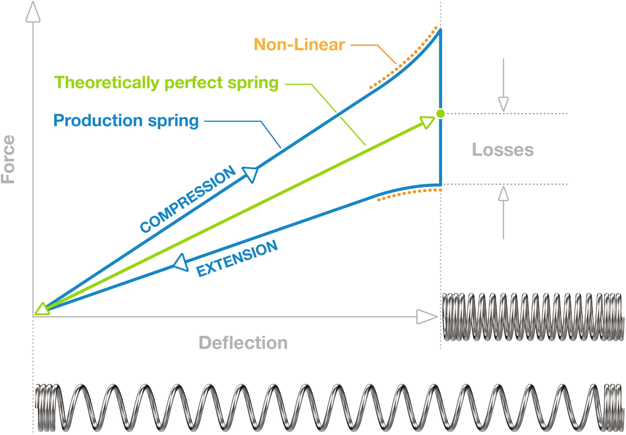 Heat treatment and spring setting can enhance performance but add complexity to accurately predicting spring output force