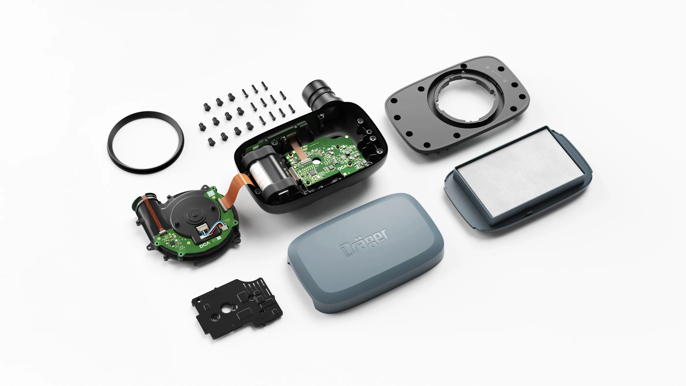 The X-plore 8300 exemplifies a repairable device built for longevity and sustainability. Its easily replaceable components, like the battery, blower unit, PCB, gasket and housing encourage users to make repairs instead of discarding the entire unit. When a part malfunctions, a straightforward swap with a new component restores functionality, helping to minimise waste. Spare parts are offered by Dräger Service.